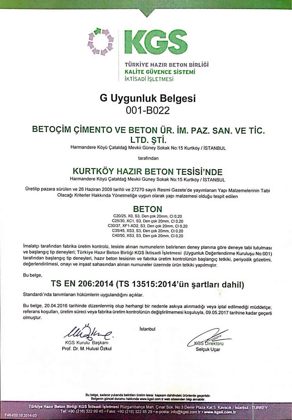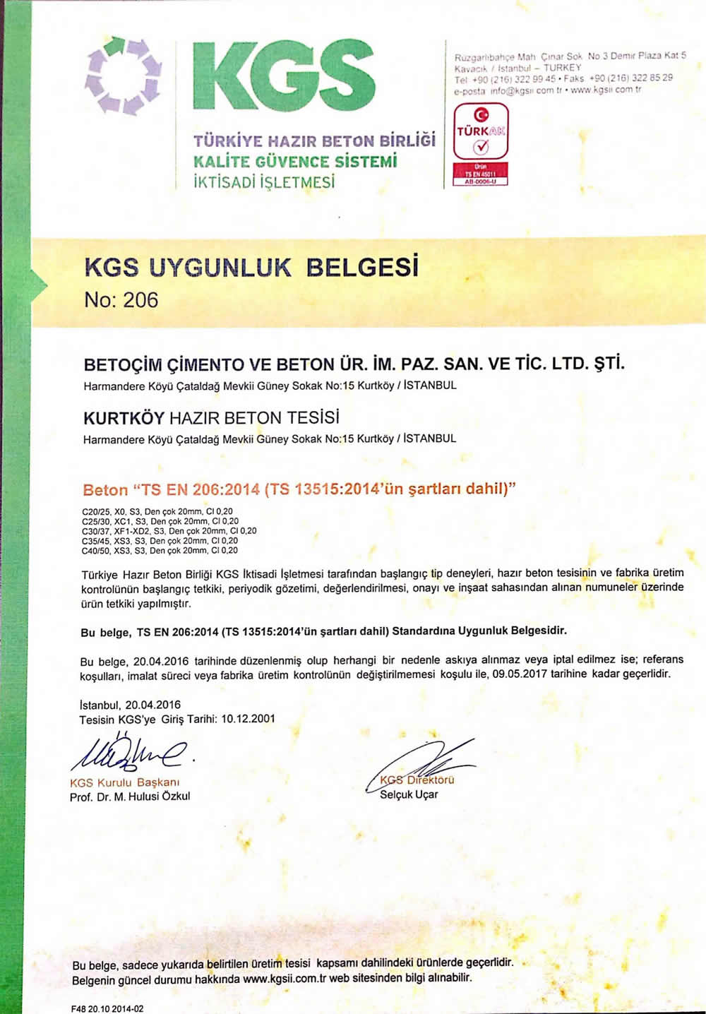 Tesisimizde, beton imalatında kullanılan dökme çimento, Portland Çimento (PÇ 42,5)'dur.Bu yüksek kaliteli Portland çimentoyla imal edilen hazır betonumuzda Uçucu Kül kullanılmamaktadır.